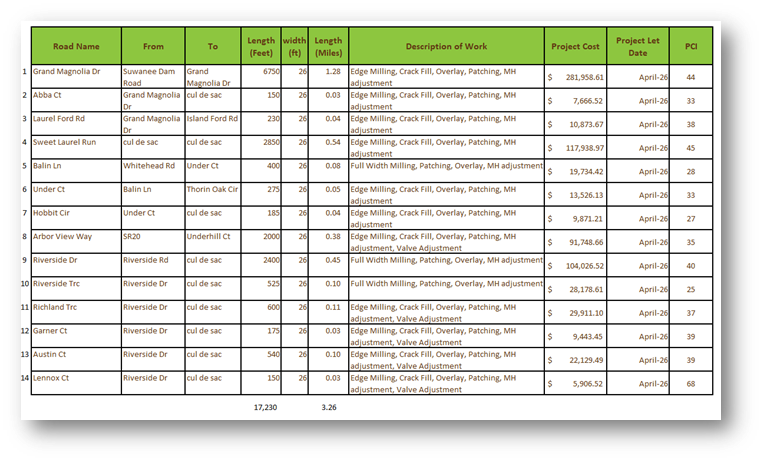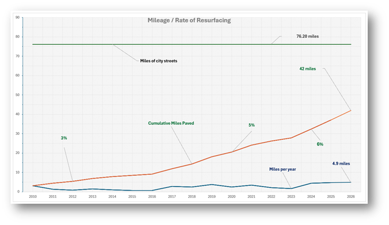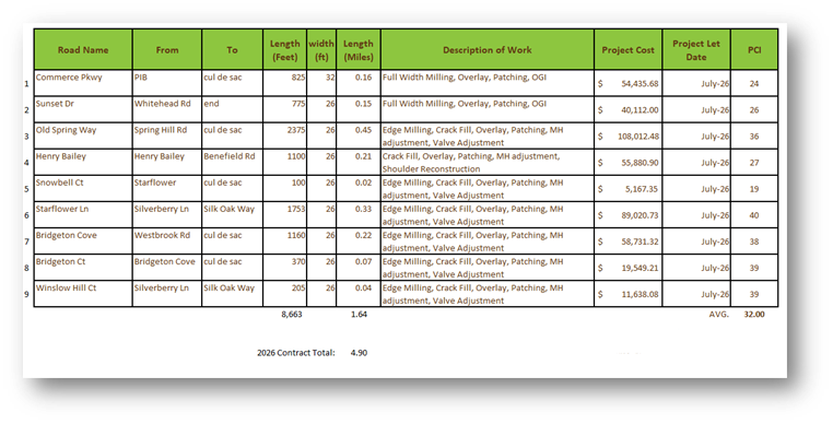 IFB 26-001 was advertised to find a contractor to pave various streets in the City. Bids were opened on March 3rd. We are evaluating them now. A recommendation will be made at the April City Council meeting. Additional funding has been provided by the State under the amended 2026 budget from the Local Road Assistance program. So, nine (9) additional streets will be added to the contract request and making the total length of road repairs close to 5 miles for this year.